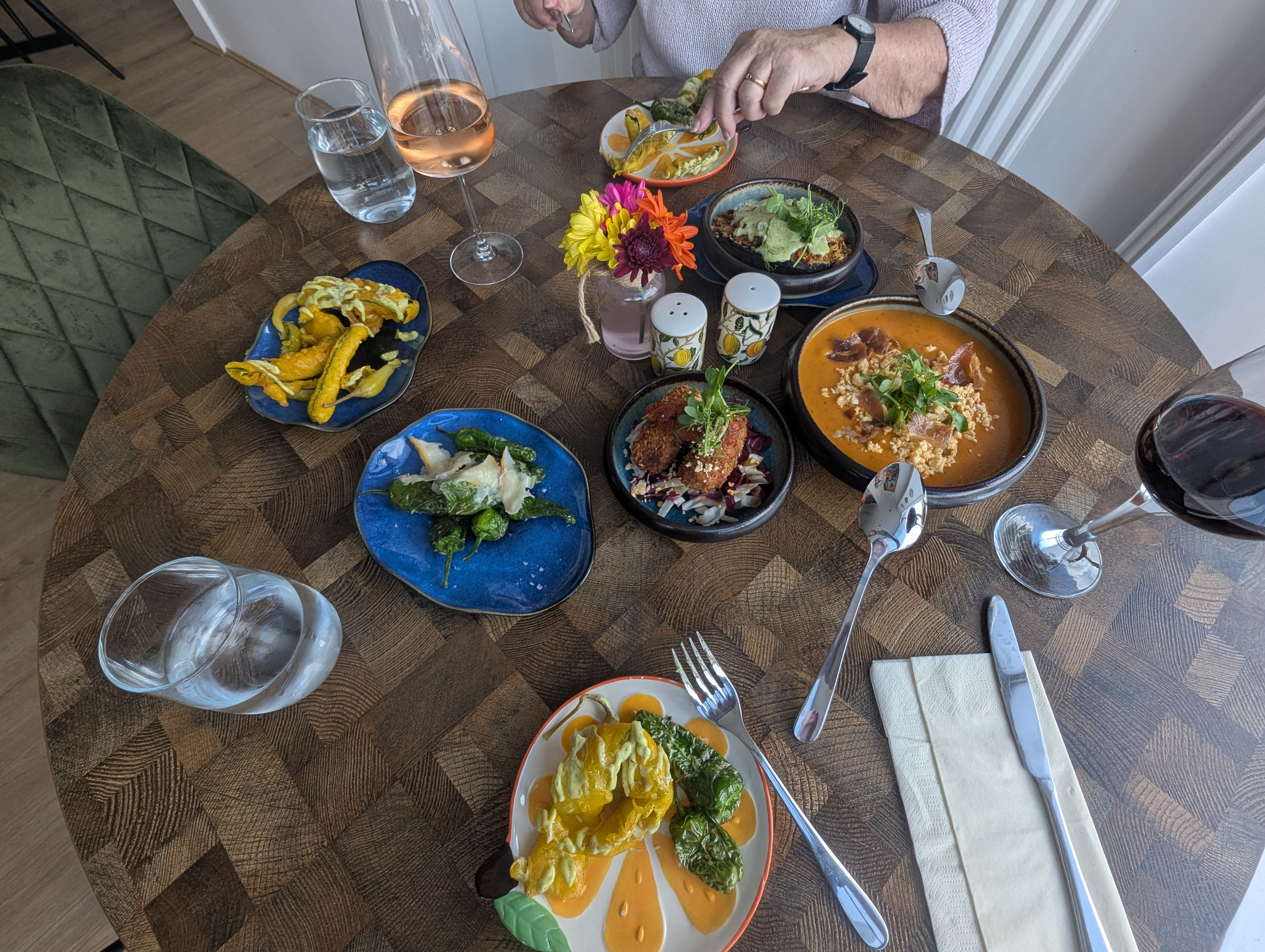 Still cloudy, though thankfully dry. We walked into St Neots for lunch and decided to try a newly opened tapas bar, Vino Tapas and Wine. We shared a meze-style meal which turned out to be excellent — fresh, well-flavoured, and beautifully presented. We were the only diners at lunch, apart from one woman who seemed to be waiting for a friend who never arrived. The restaurant is small and cosy, located downstairs with a good view of the marketplace — perfect for people-watching. I do hope they attract more customers; they certainly deserve to.