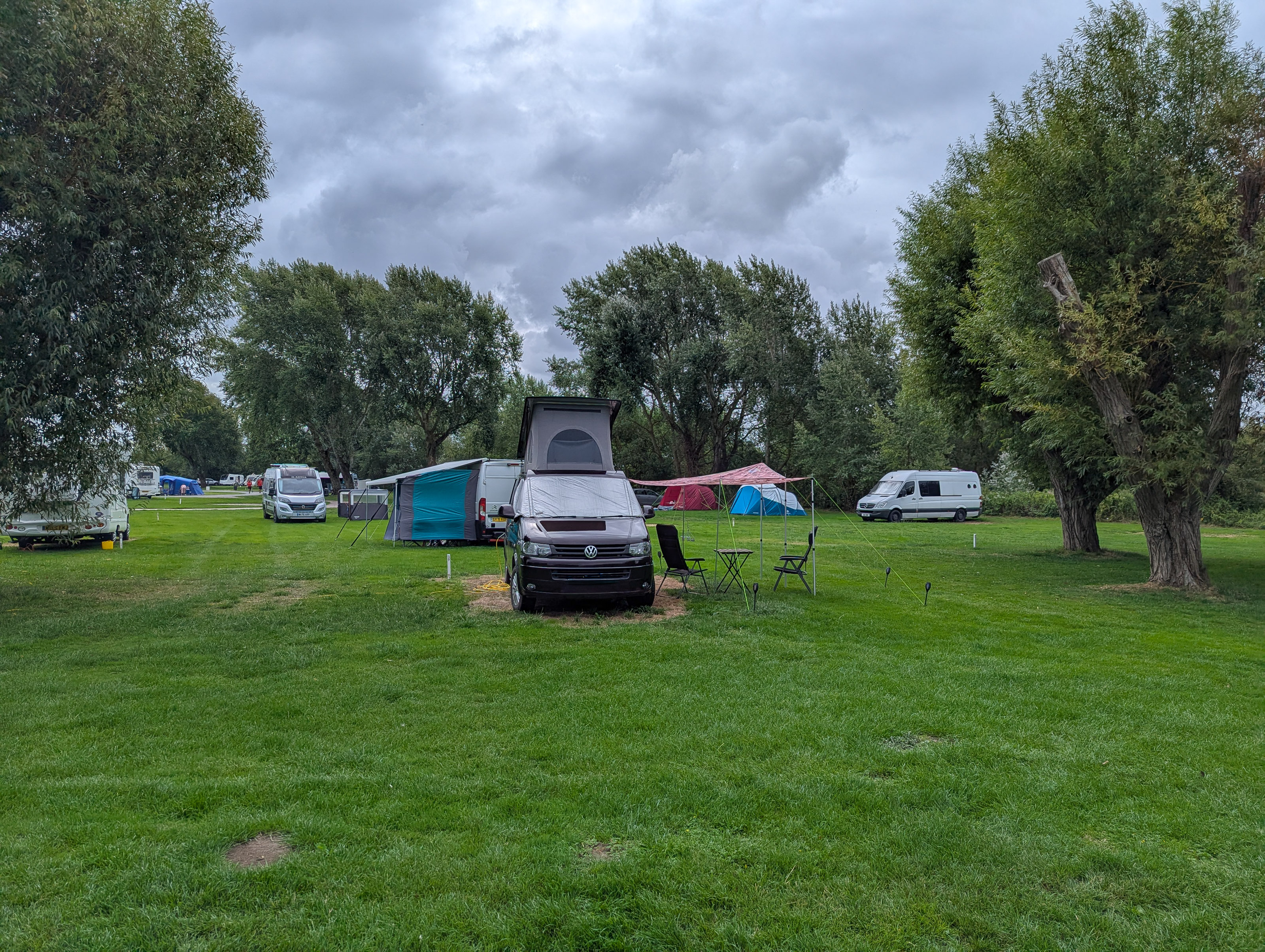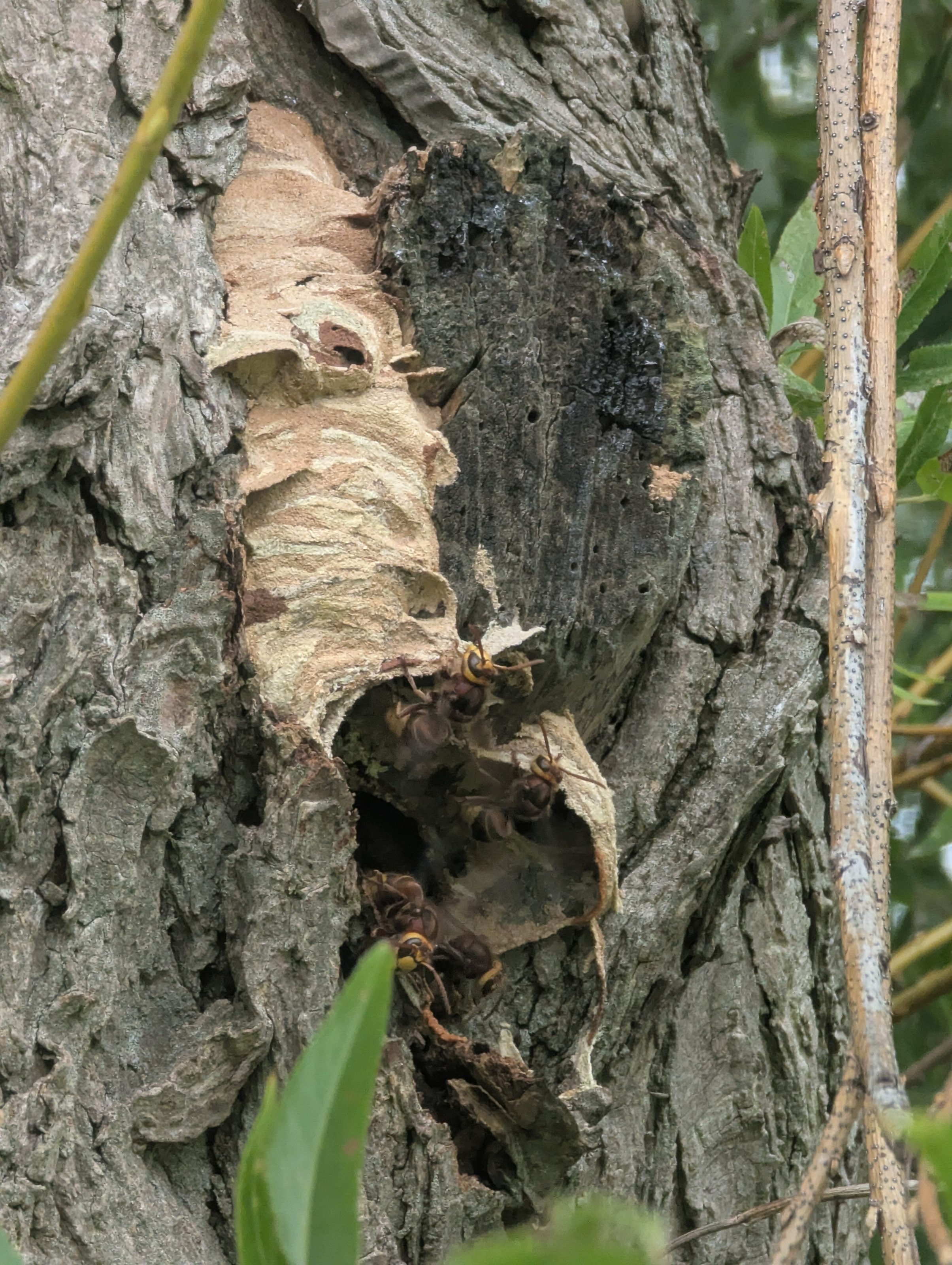 In the afternoon, I took another walk to Eynesbury, crossing the lifting bridge and stopping at Tesco to purchase the Guardian before returning to camp. Later, we noticed our neighbours had moved on — not, as we first feared, because of us, but due to a hornets’ nest discovered in nearby trees. We’d seen one ourselves and decided to ignore the little beasts, but our neighbours reported theirs to the wardens. I suspect the hornets’ days are now numbered. When we first saw the nest, a passing camper remarked he worked in pest control. He’d said how he’d been watching a bees’ nest which was also being watched by hornets. The hornets would lie in wait for the bees to fly in, grab them, behead them and take the body back to their own nest.