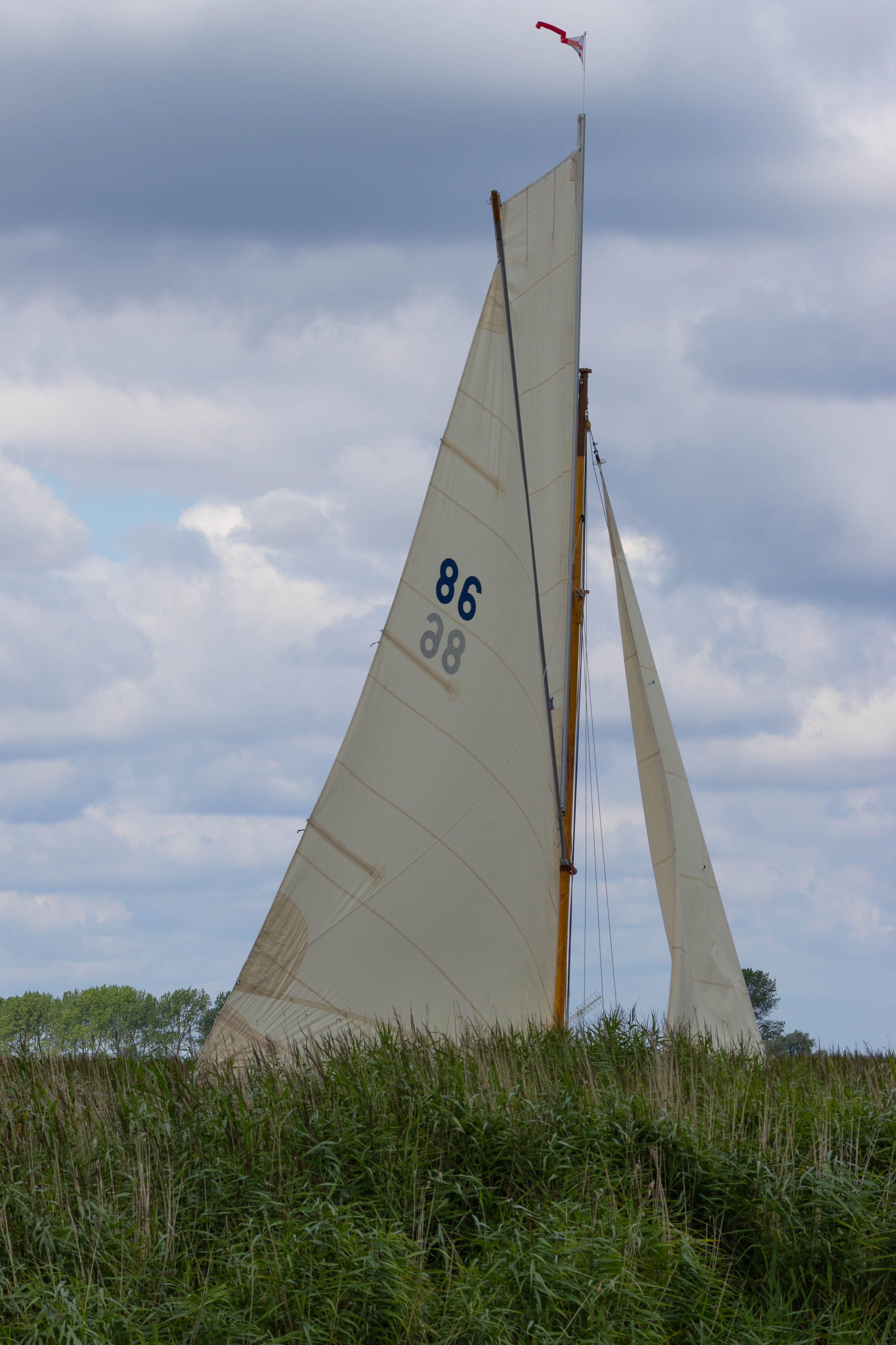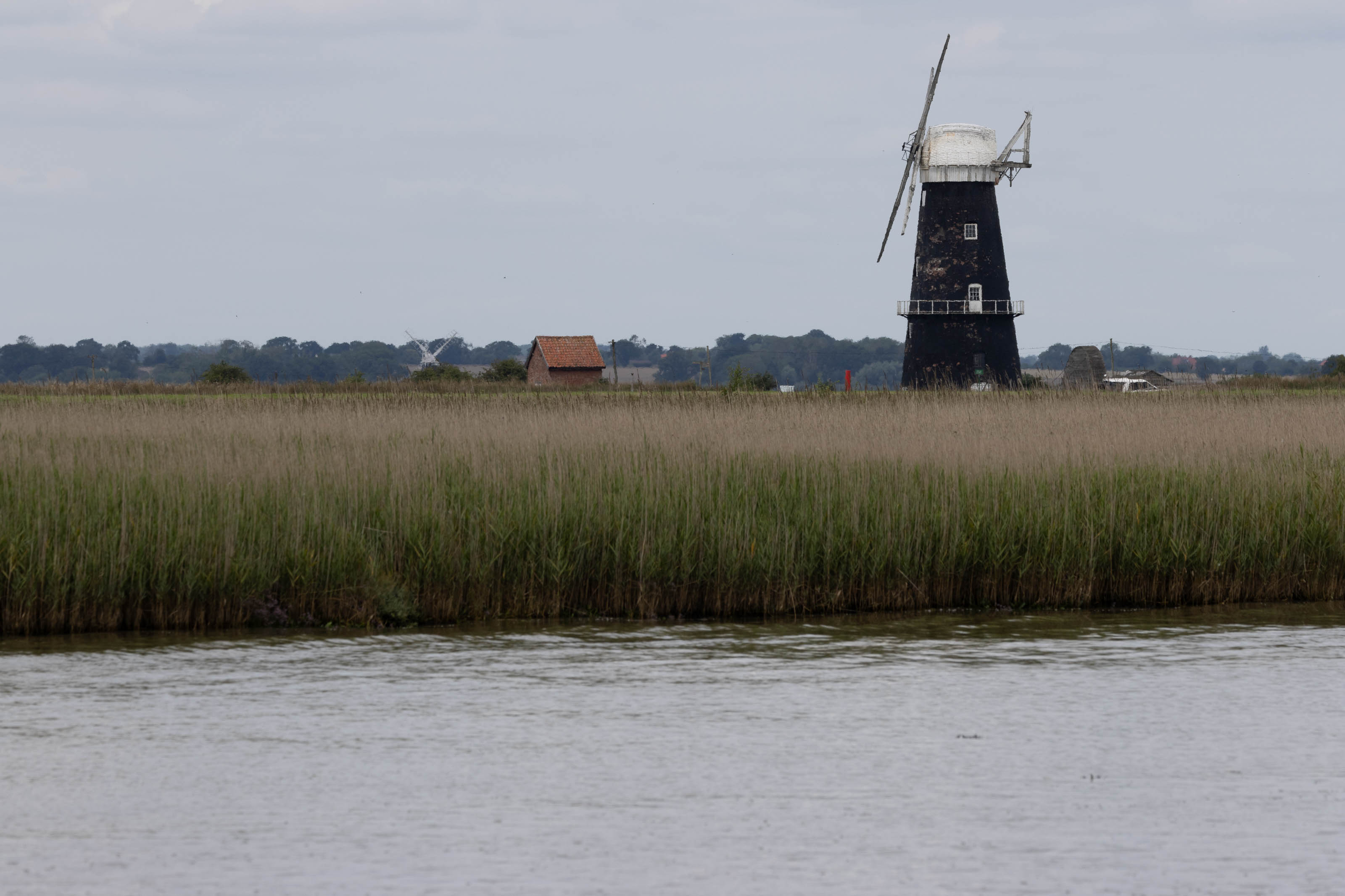 Although the footpath runs along the top of the river bank, you don’t actually get a view of the river. A thick wall of reeds blocks the view, so all you can see of the boats are their sails, floating above the greenery like strange, detached shapes. On the landward side, the drained fields, ditches and hedges sit below river level. They’re kept dry by electric pumps, which replaced the many traditional wind pumps once common across the Broads.