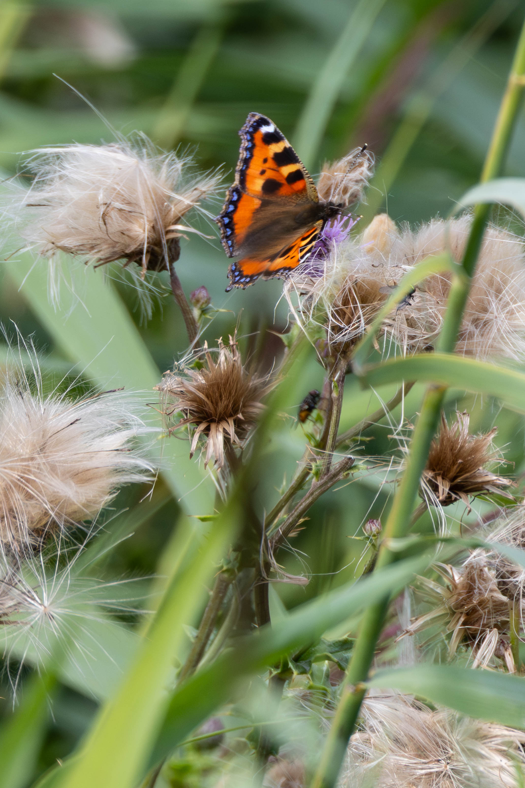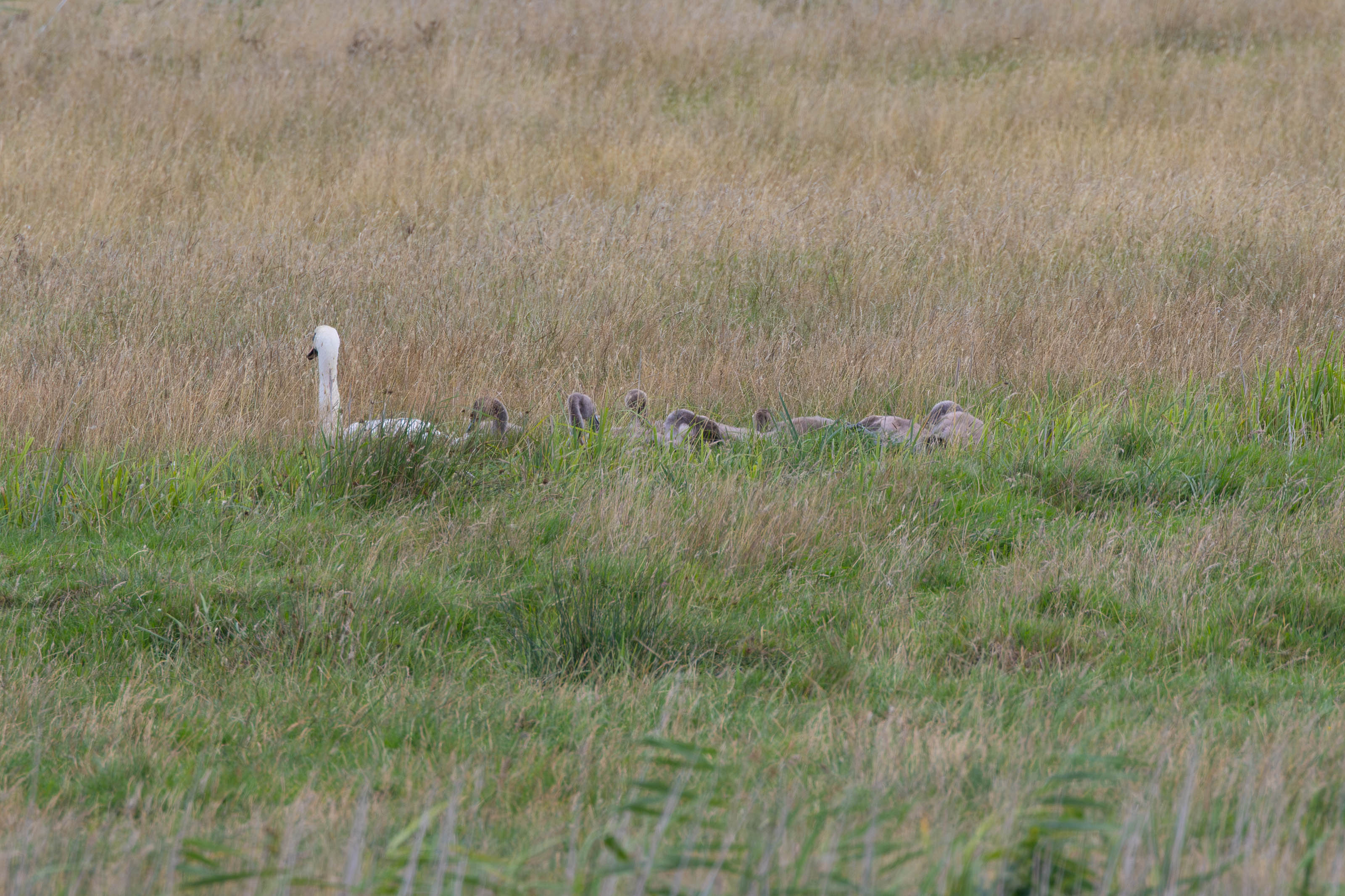 In the ditches and meadows we spotted numerous swan families—two attentive adults shepherding their fluffy grey cygnets. Along the way we also managed to spot cranes, oystercatchers (a little far from the seaside, but evidently happy), and several butterflies: tortoiseshells, cabbage whites, and a wall brown, but no Swallowtails.
