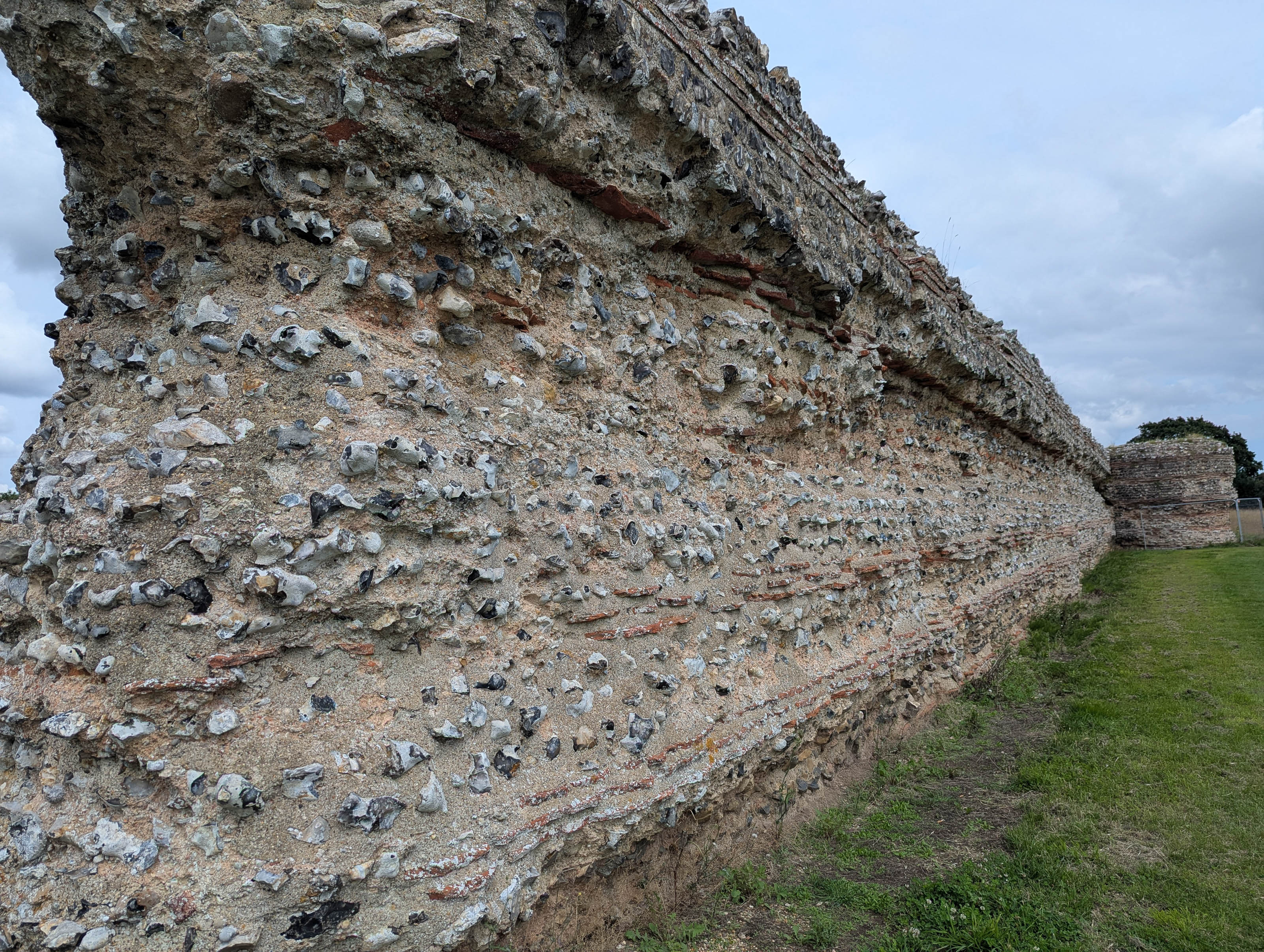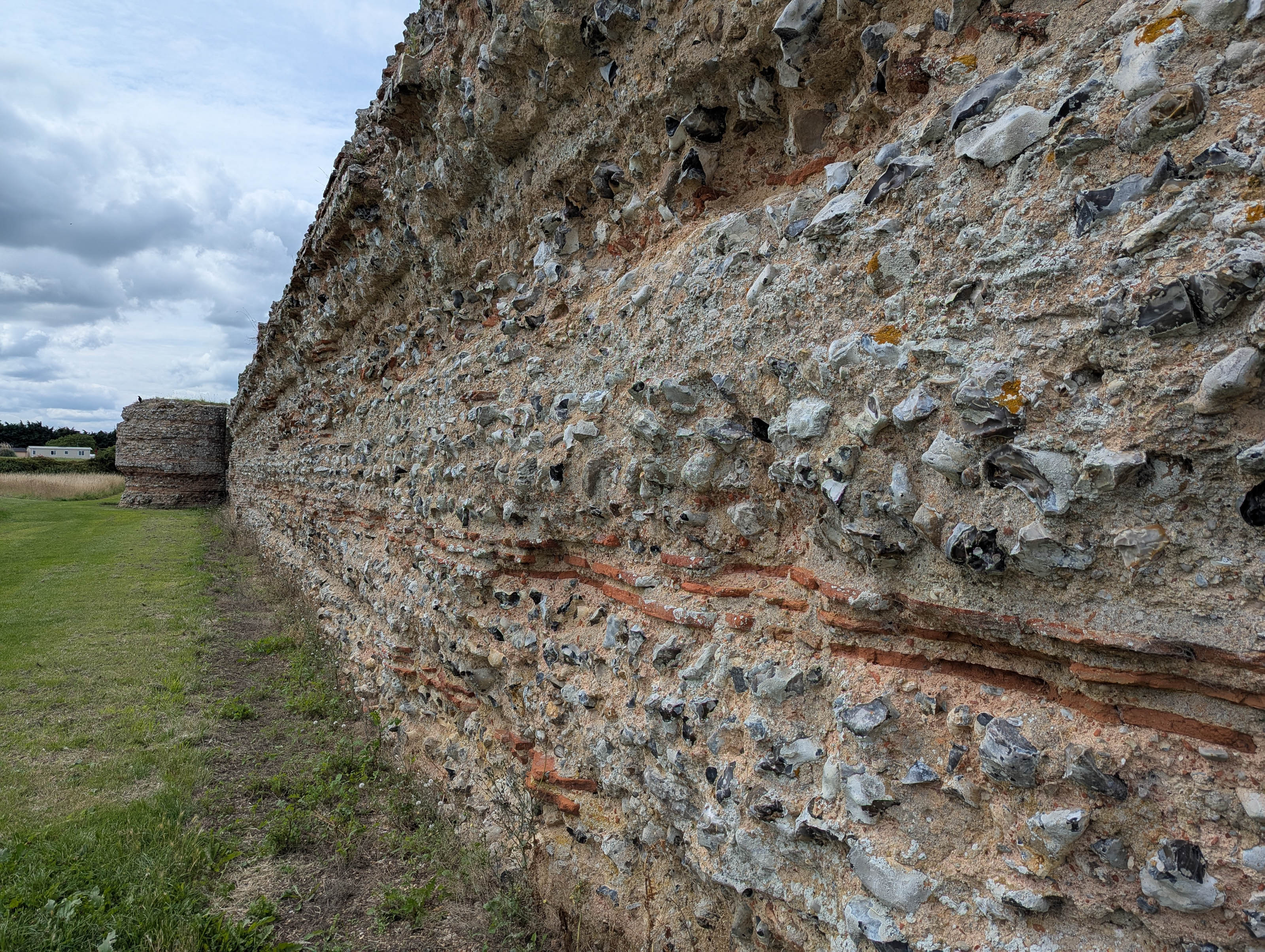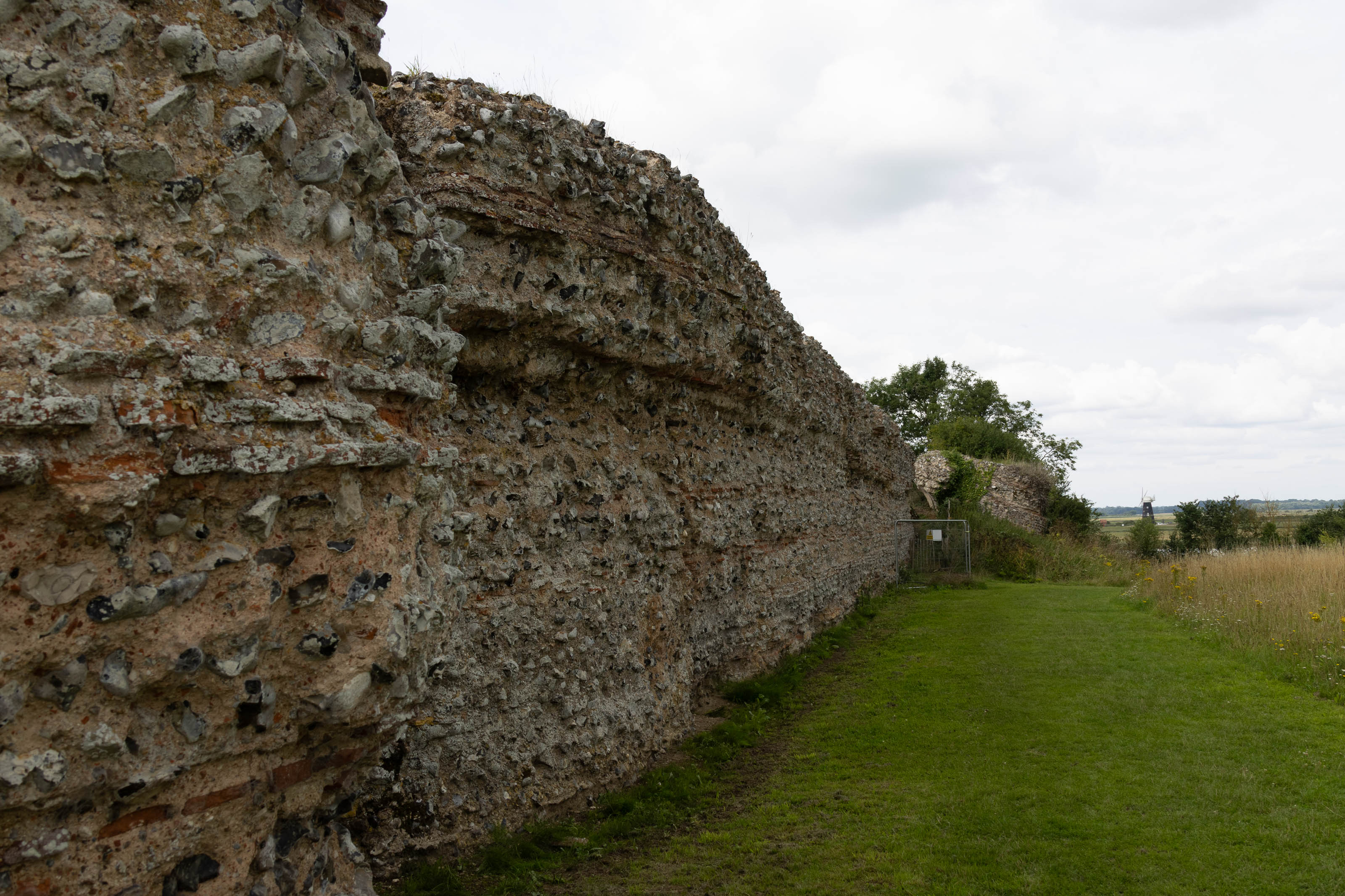 Once across, we drove towards Haddiscoe, taking a brief detour to the railway station to see how it had changed in the last fifty-five years, since I used to use it. Then we crossed the River Waveney to visit Burgh Castle (pronounced “Borough Castle”). The fort is one of the best-preserved Roman structures in Britain, built in the late 3rd century as part of the Saxon Shore defences. Its massive flint and brick walls once housed Roman troops tasked with controlling the local tribes and guarding the river estuary. A group of people were obviously having a celebration of life ceremony.