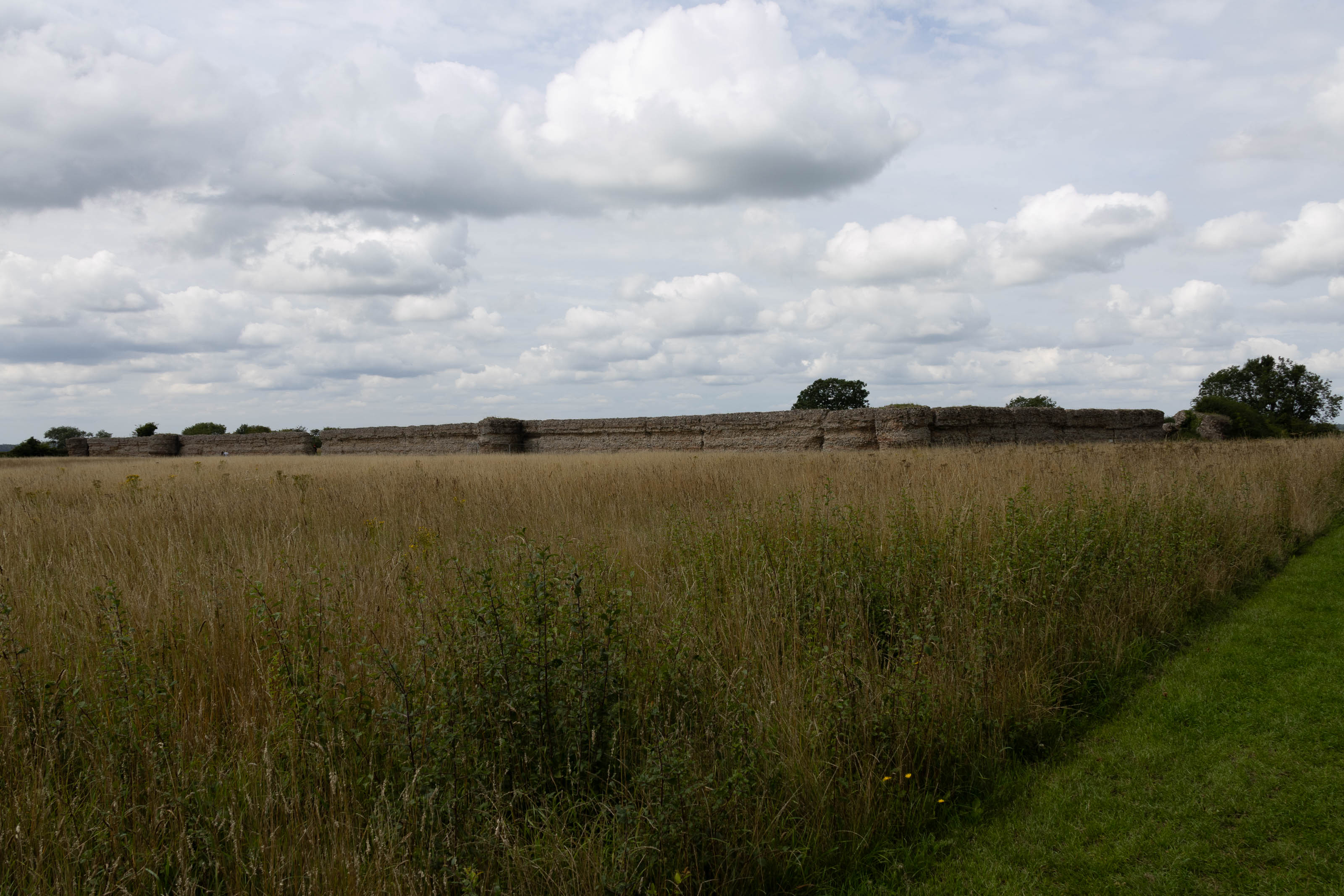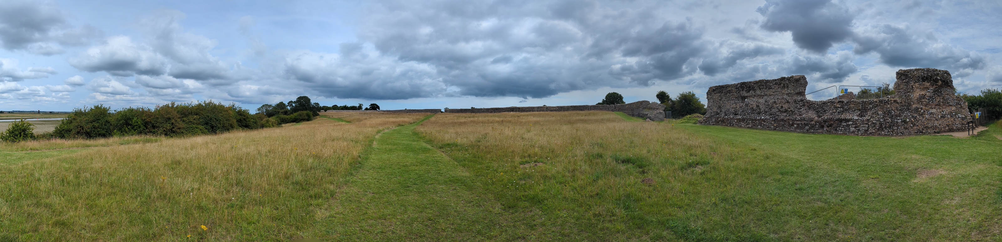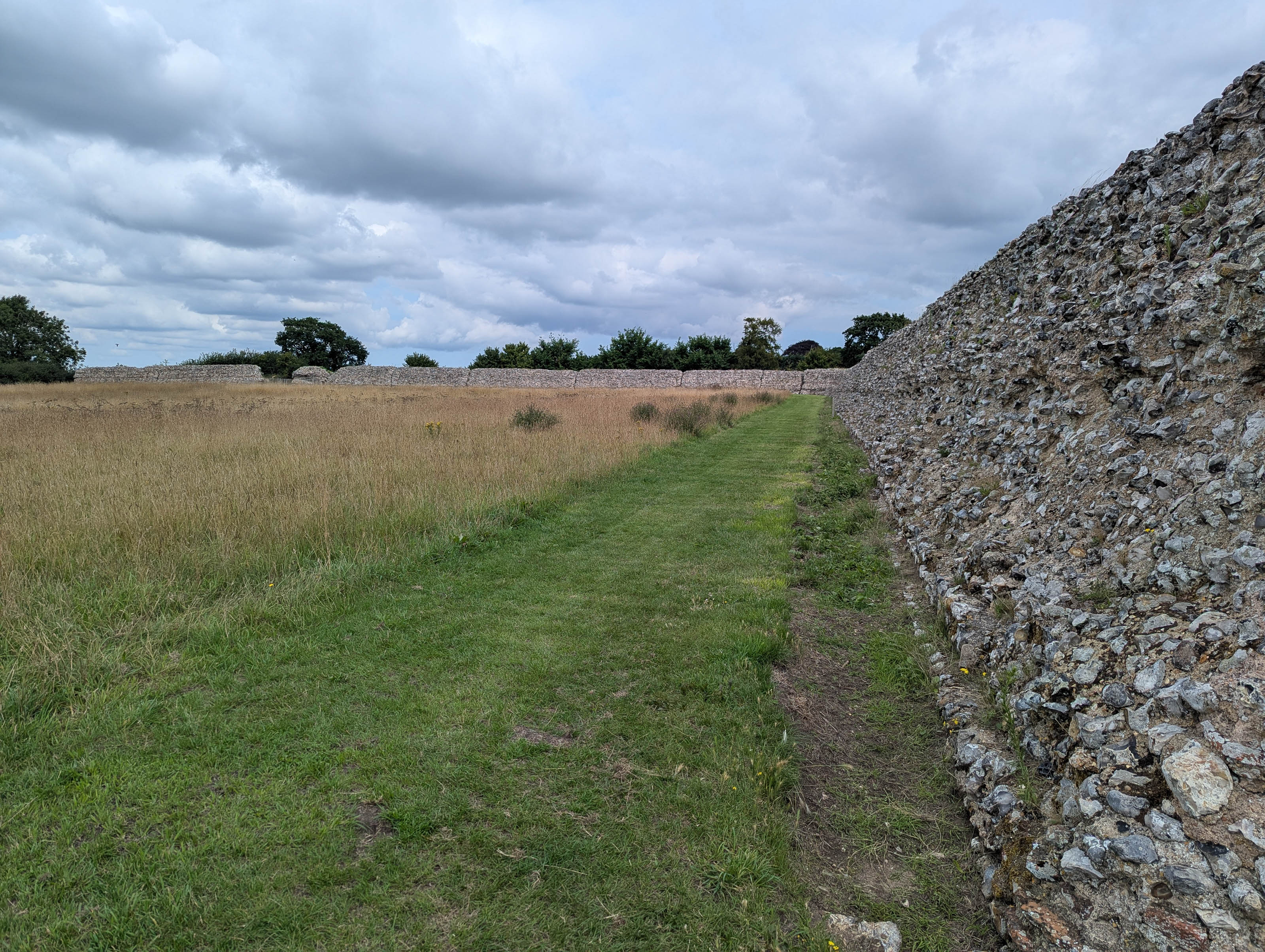 Once across, we drove towards Haddiscoe, taking a brief detour to the railway station to see how it had changed in the last fifty-five years, since I used to use it. Then we crossed the River Waveney to visit Burgh Castle (pronounced “Borough Castle”). The fort is one of the best-preserved Roman structures in Britain, built in the late 3rd century as part of the Saxon Shore defences. Its massive flint and brick walls once housed Roman troops tasked with controlling the local tribes and guarding the river estuary. A group of people were obviously having a celebration of life ceremony.