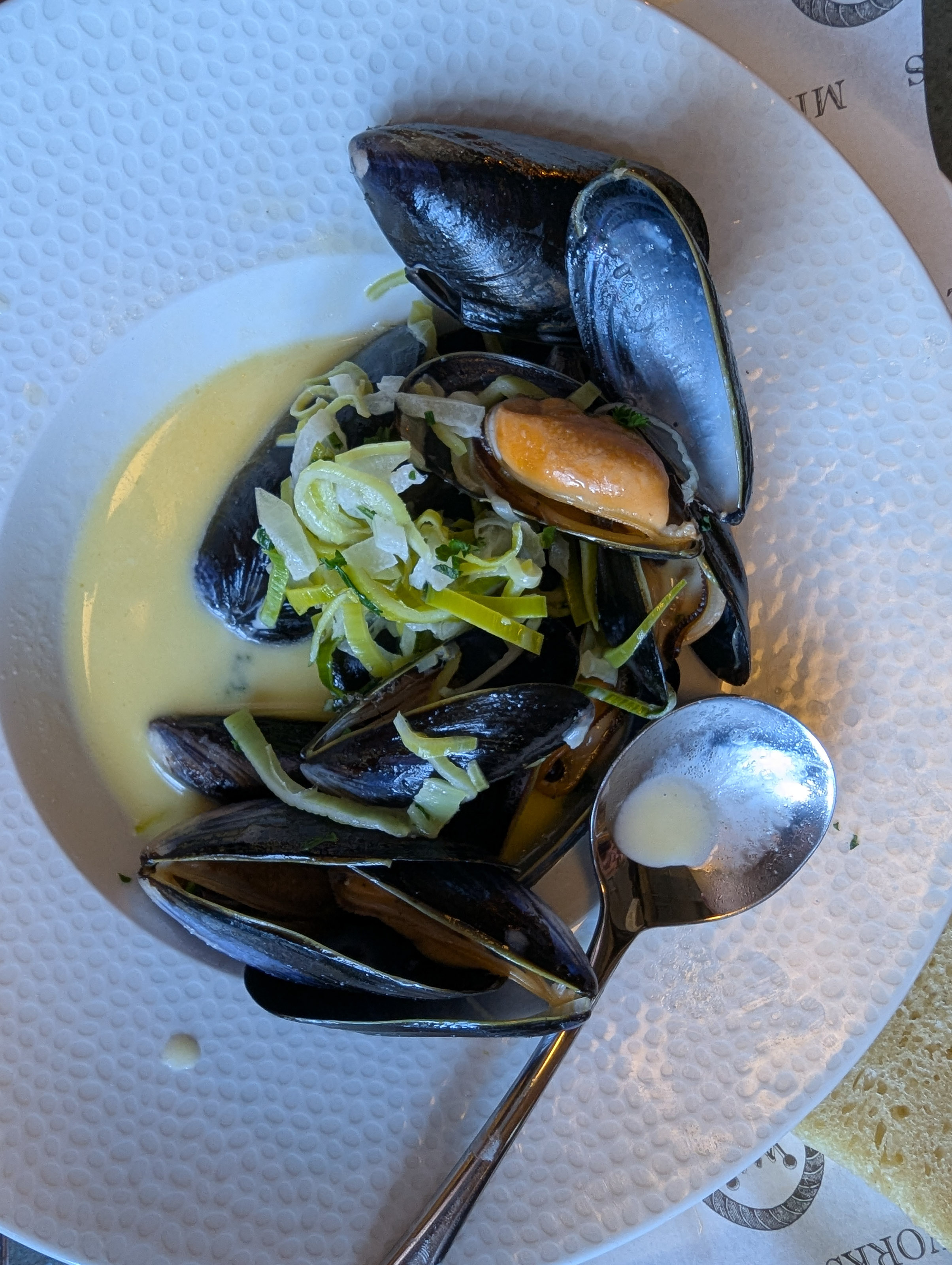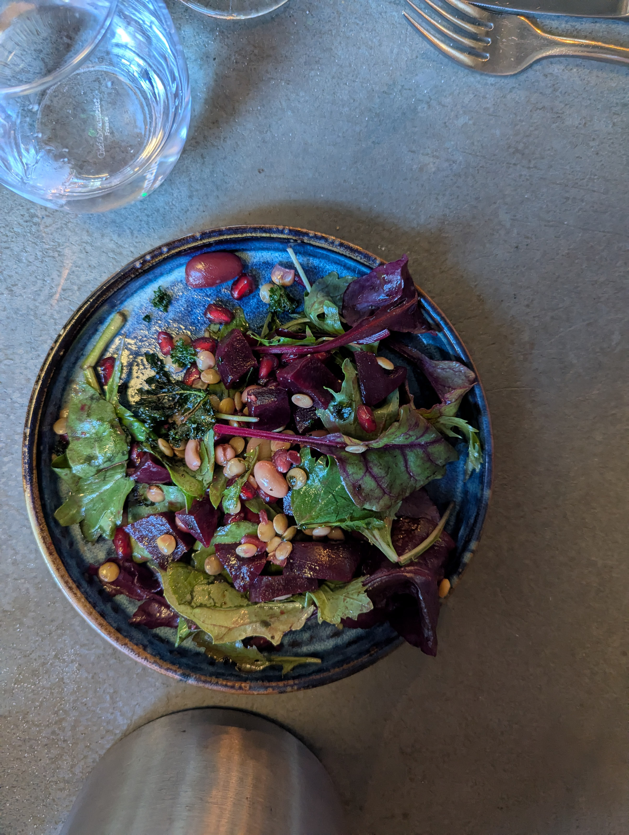 I began with Shetland mussels, and they were some of the best I’ve ever had — large, plump, and juicy, served in a delicious, fragrant sauce. Isit the cold waters of Shetland that make them so good? They easily outshone any mussels I’ve eaten in France, which so often arrive broken, tightly closed, or disappointingly small. R had a salad of beans, beetroot, and leaves — fresh, colourful, and beautifully presented.