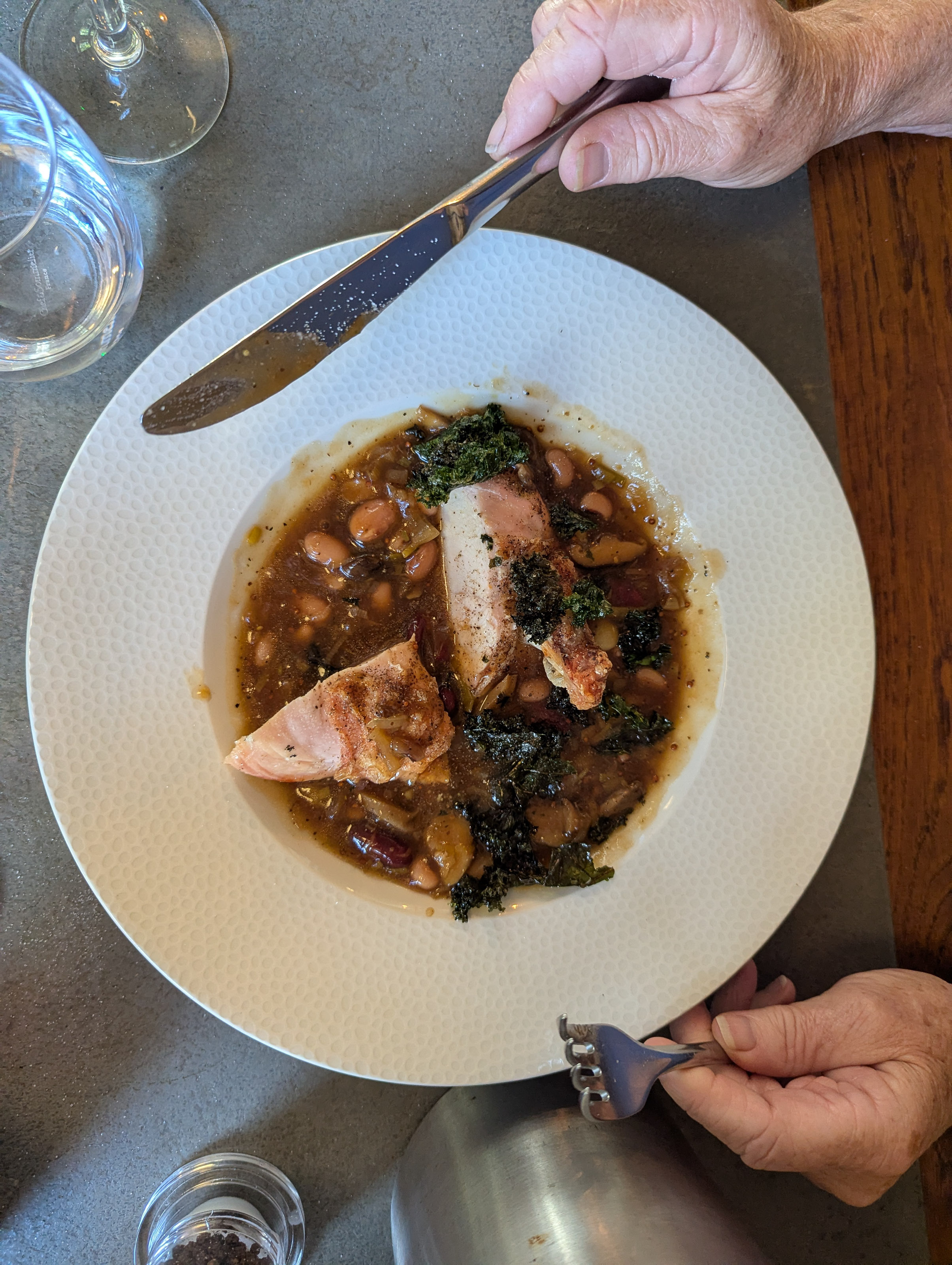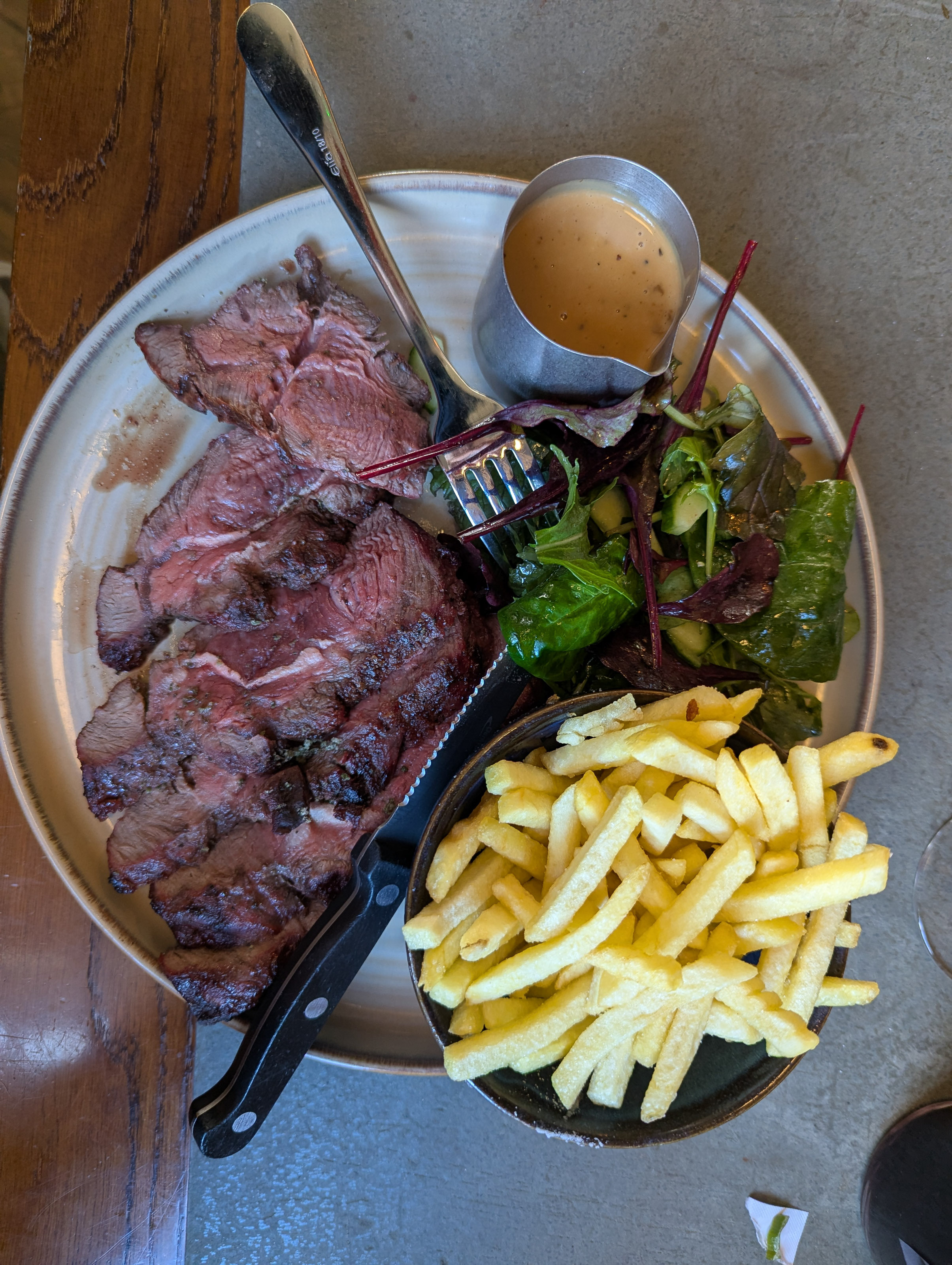 For my main course, I went for the classic steak and chips. The cut was a flat iron steak — one of the cheaper cuts — but it was perfectly cooked, with a lovely crust on the outside and tender inside. R enjoyed a chicken supreme served in a mixed bean cassoulet, which she declared excellent.
