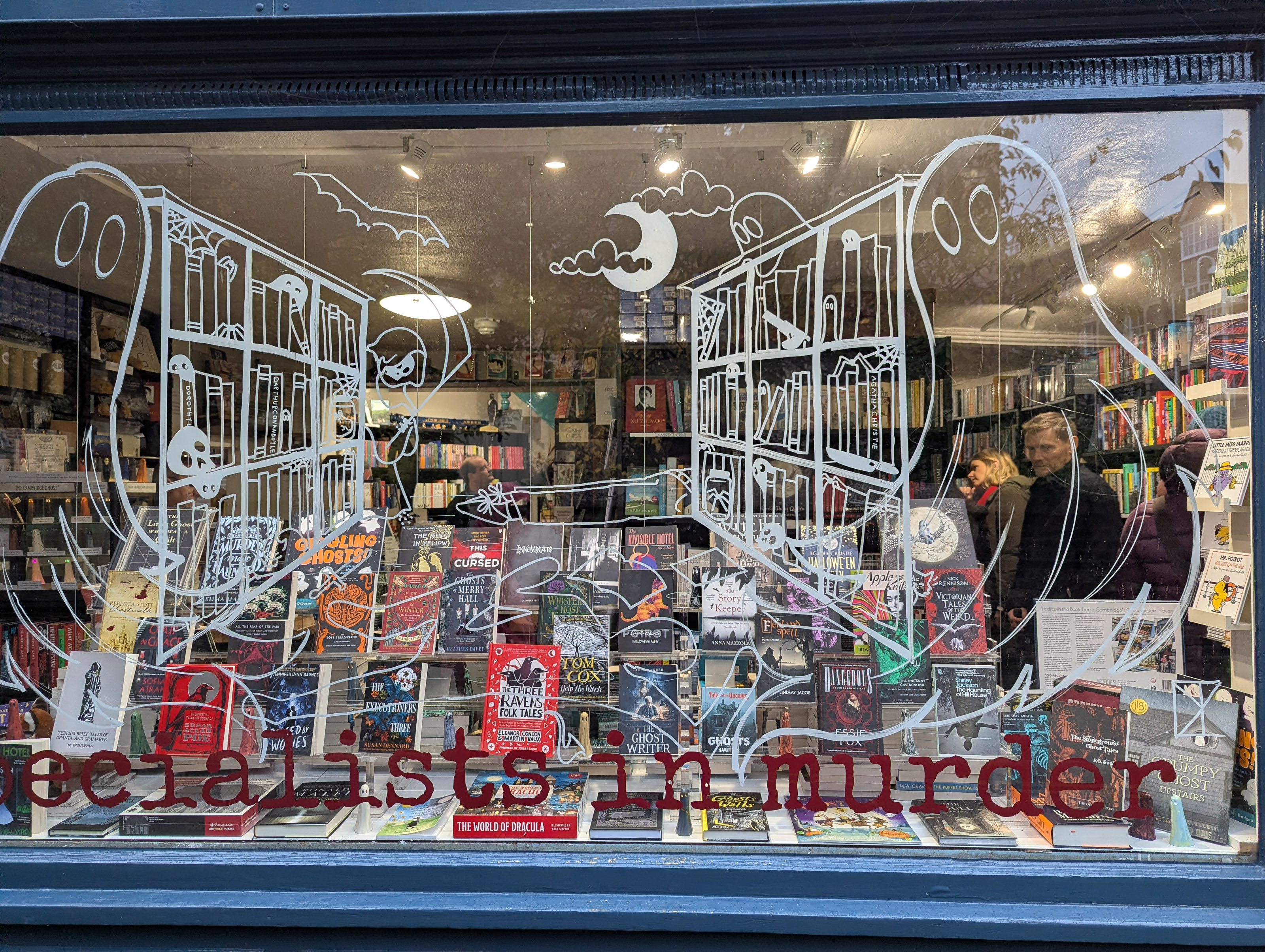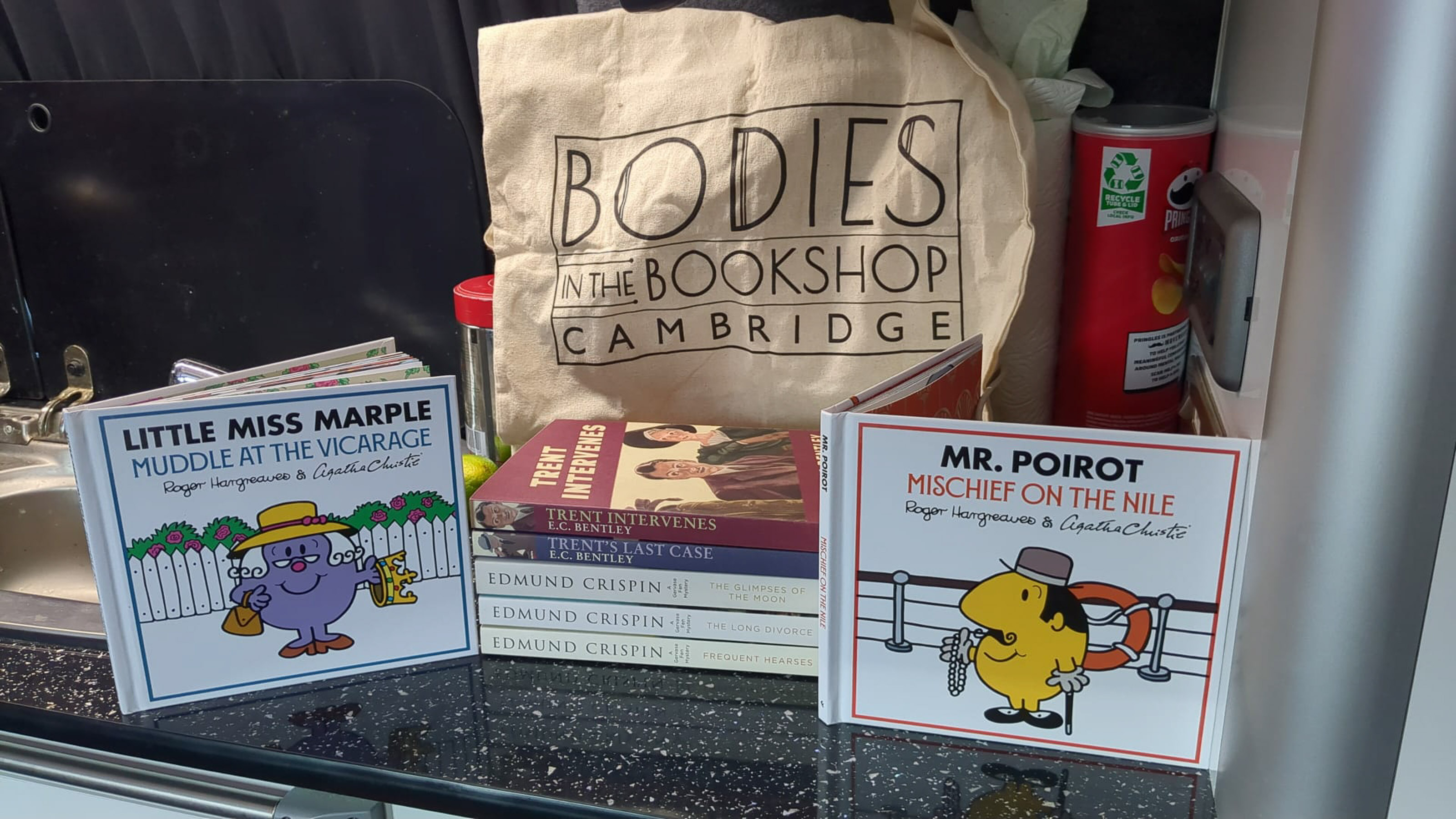 Our next stop was the delightfully named Bodies in the Bookshop, a small independent bookshop. R, true to form, began browsing enthusiastically and soon was buying half the shop. She mentioned the new Mr Men & LittleMiss Agatha Chrsitie themed books, published today. She bought a copy of each followed by a friendly chat with Richard, one of the owners, having been particularly impressed by knowledge and their current window display. We left as he was ordering more copies of the AC books Later, she emailed them to say how much she admired the window display — and, the next day, received a reply to say the display had since been changed. Naturally, we returned soon after to see the new version.