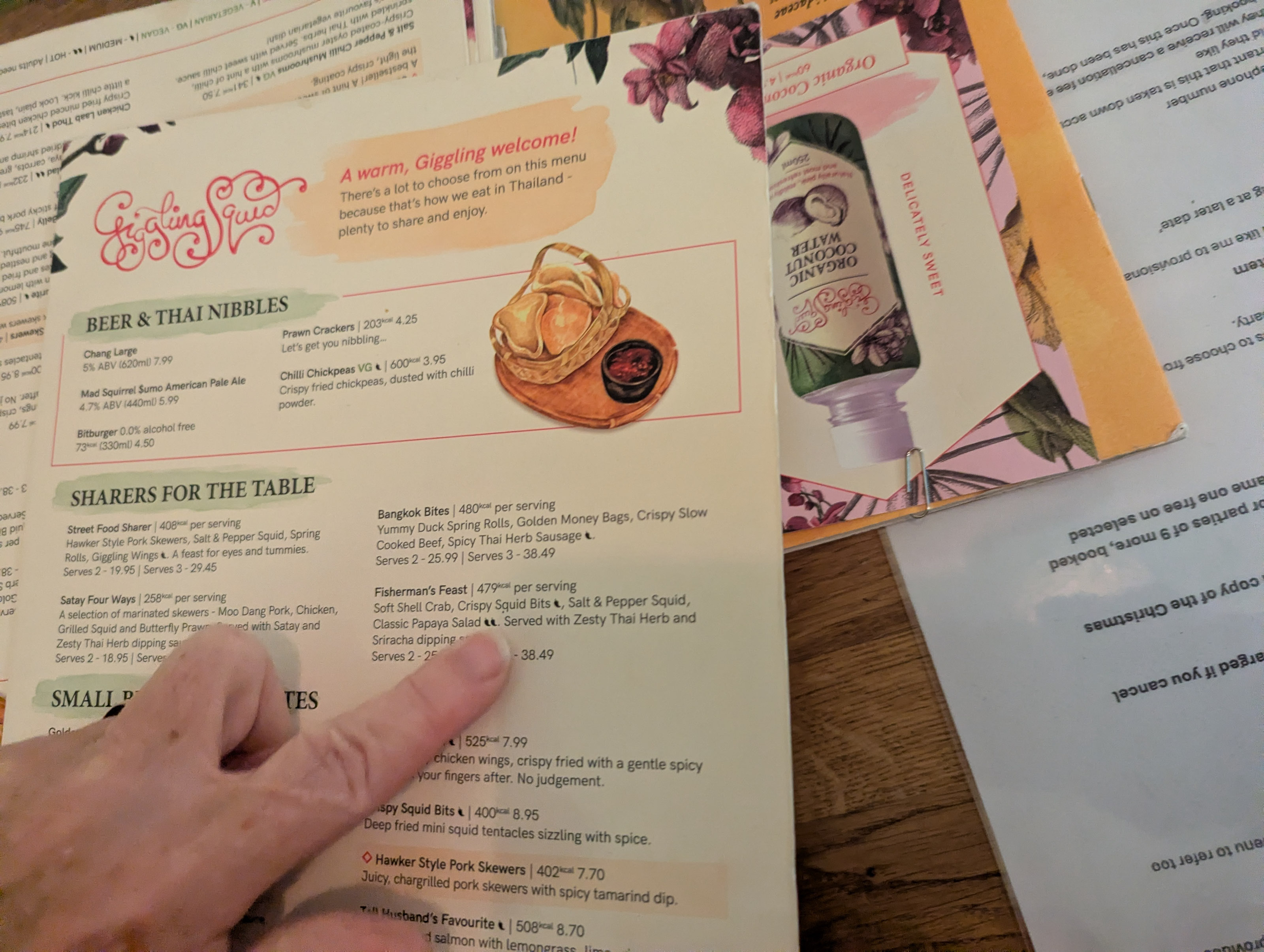 By closing time we were politely ushered out of Heffers so we walked over to the Giggling Squid (again) for supper. We’d enjoyed it last time and R was keen to return. This time it was busier, and I think we were lucky to get a table.