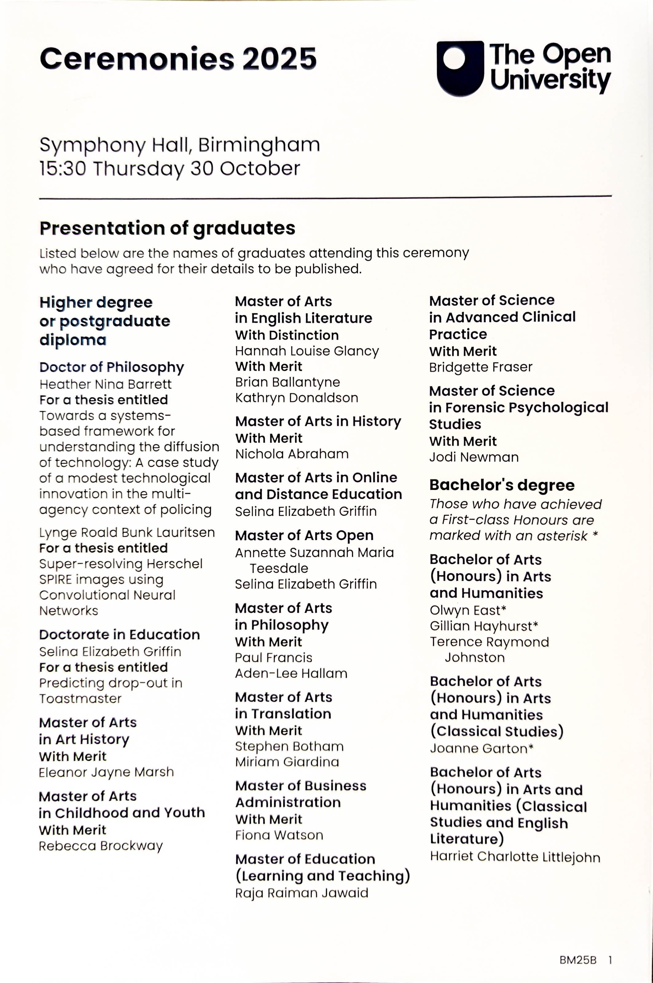 Our daughter Selina invited us to attend her degree ceremony at the Birmingham Symphony Hall. She was to receive not one, but three awards. Two Master of Arts to add to her existing collection of MAs, and a Doctorate in Education for a thesis entitled Predicting drop-out in Toastmasters.
