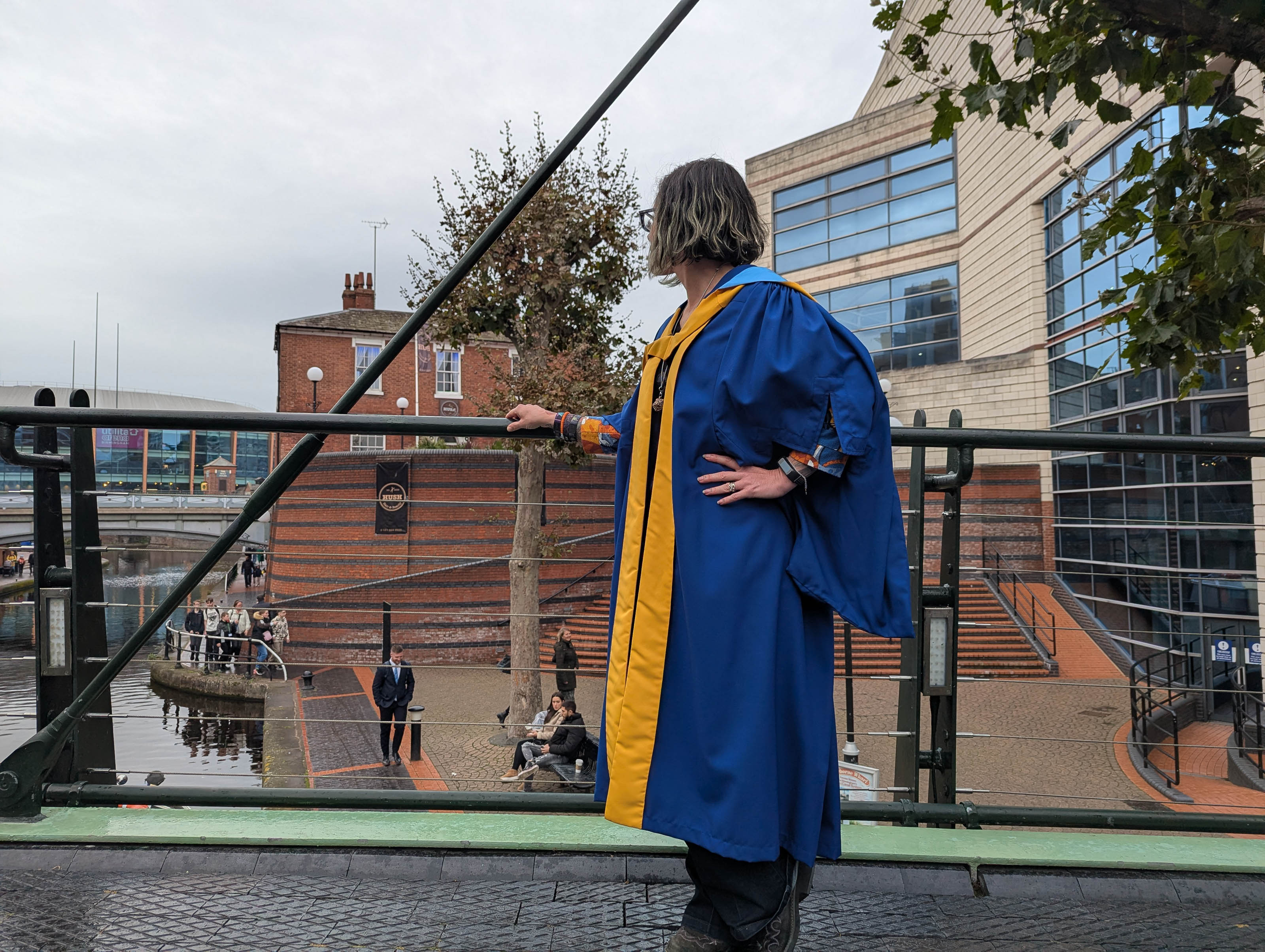 The two of us plus Phil headed up to Birmingham, and eventually managed to park in Arena Birmingham (South Car Park). We had a short walk along the canal to Symphony Hall where us three drank coffee. Selina in the meantime went off to check in and put on graduation robes. Selina was then photographed by us. We also downloaded an app which allowed us to take a photograph, and pickup a free printed copy within minutes!