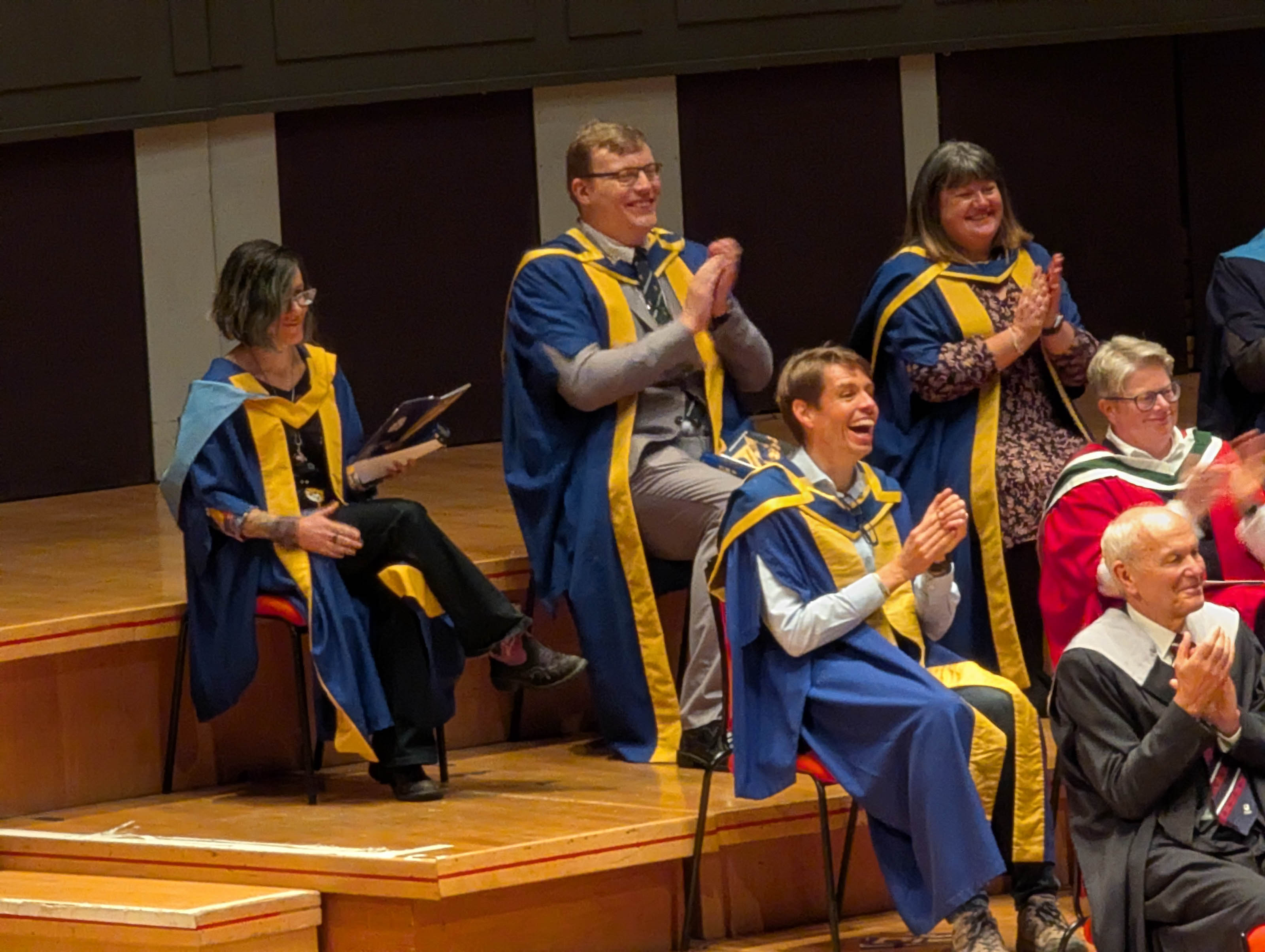 The ceremony started and groups of students were ushered out of the hall to wait in the side wings. They were then called to receive their reward. The higher degrees were awarded first, so Selina was in the first group. As she was now a Doctor, she then spent the rest of the ceremomy sitting on the stage. Those who received lesser awards were ushered back to their seats after receiving their rewards.